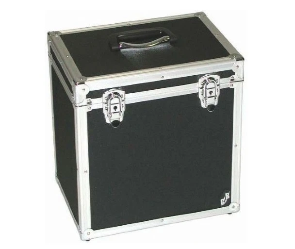 L.P. case that holds 50 12″ vinyl LP records. Hardshell plywood case covered in blakc vinyl with reinforced aluminium edges and steel corners. Drawbolt latches with locks. Rubber lined interior, foam lined detachable lid.