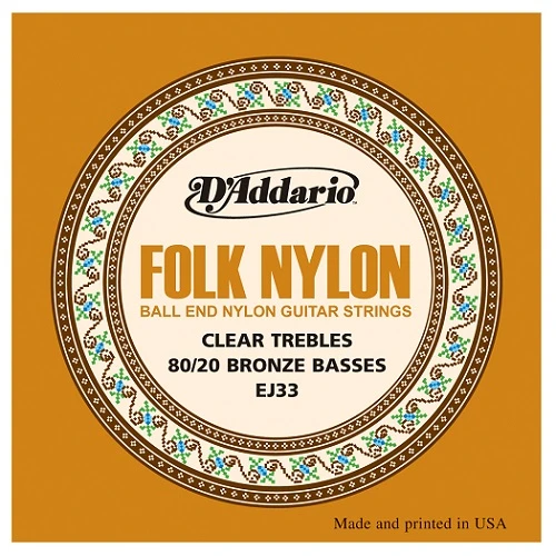 EJ33 Folk Nylon strings feature 80 20 bronze basses clear nylon trebles and D Addario ball ends to accommodate a variety of guitars and string changing options.