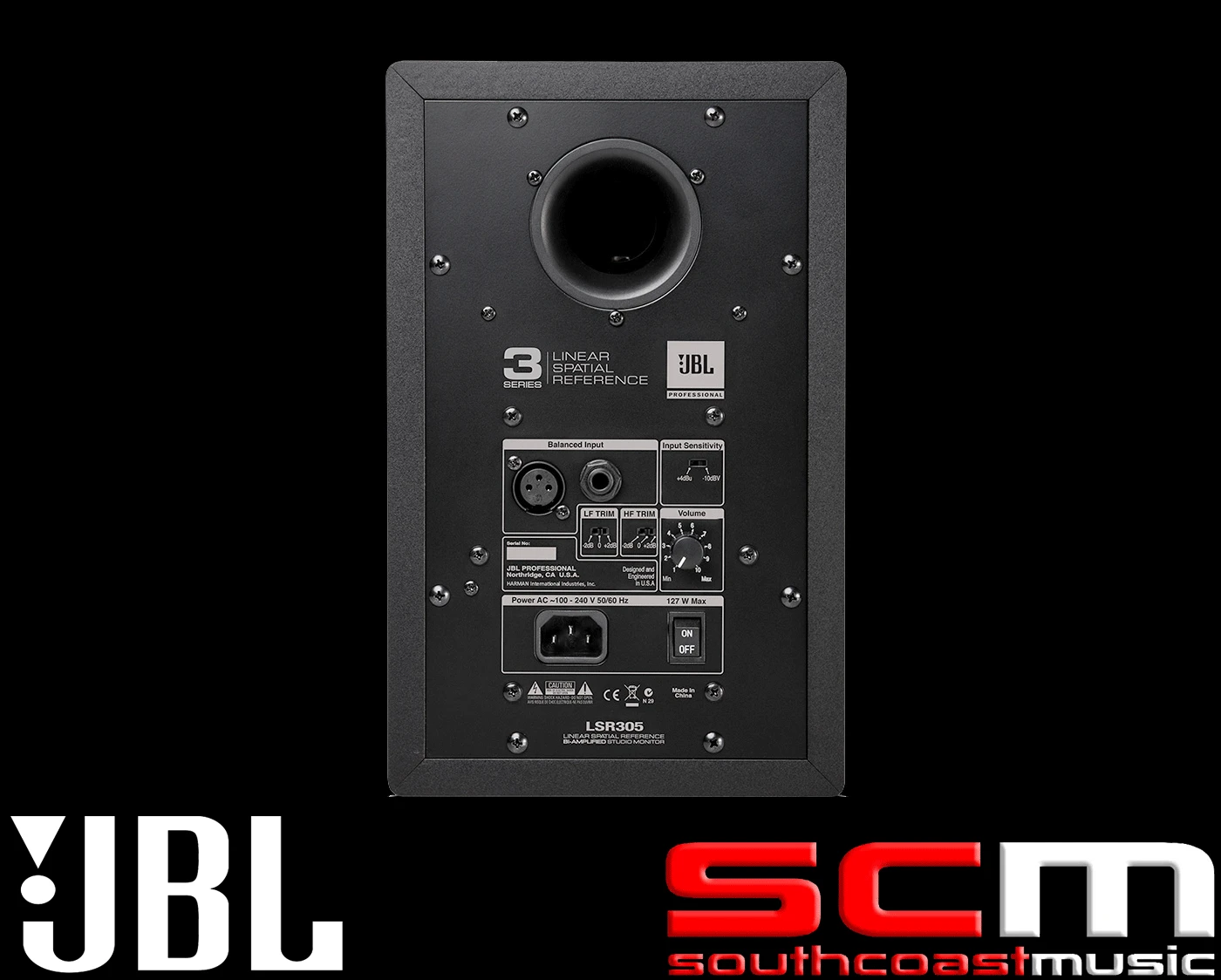 Bi-amplified Studio Monitor with Magnetically-Shielded 5” Low Frequency Transducer and 1” Soft-Dome High Frequency Transducer and Image Control Wave Guide. Class-D 41 Watt RMS Amplifier for LF, and 41 Watt RMS Amplifier for HF. Balanced XLR and ¼” TRS Inputs with Detented Level Control, HF and LF Trim Controls. LSR305 Includes US Power Cord. LSR305/230 Includes international Power Cord.