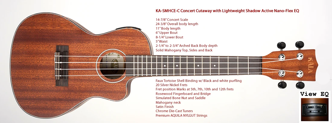 The Kala KA-SMHCE-C is a good quality all solid mahogany tonewood electro acoustic ukulele in concert size. It has an attractive satin finish together with tortoiseshell style binding, 20 silver nickel frets, simulated bone nut and saddle and good quality geared machine head tuners. Oh… and it sounds nice too!