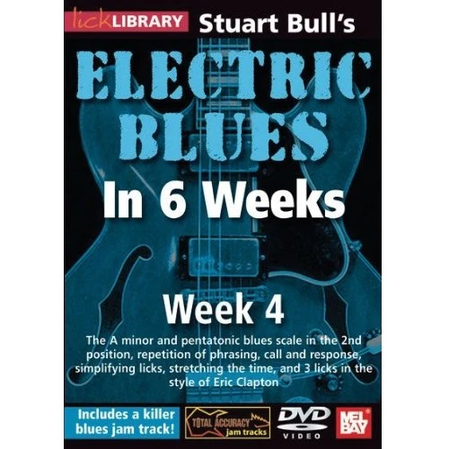 Week four includes The A minor and pentatonic blues scale in the 2nd position, Repetition of phrasing, Call and response, Simplifying licks, Stretching the time, 3 licks in the style of Eric Clapton.